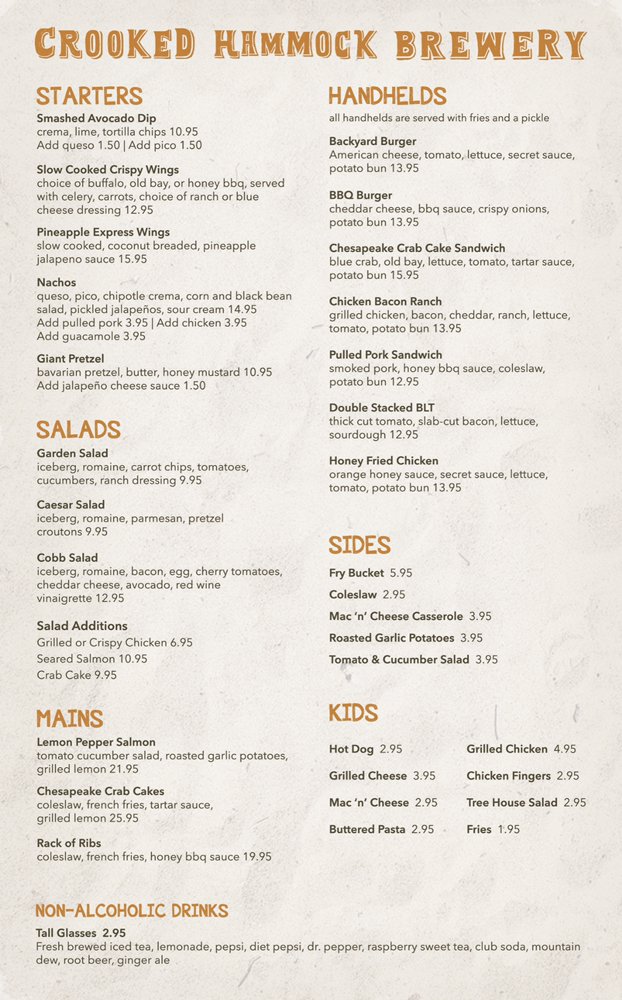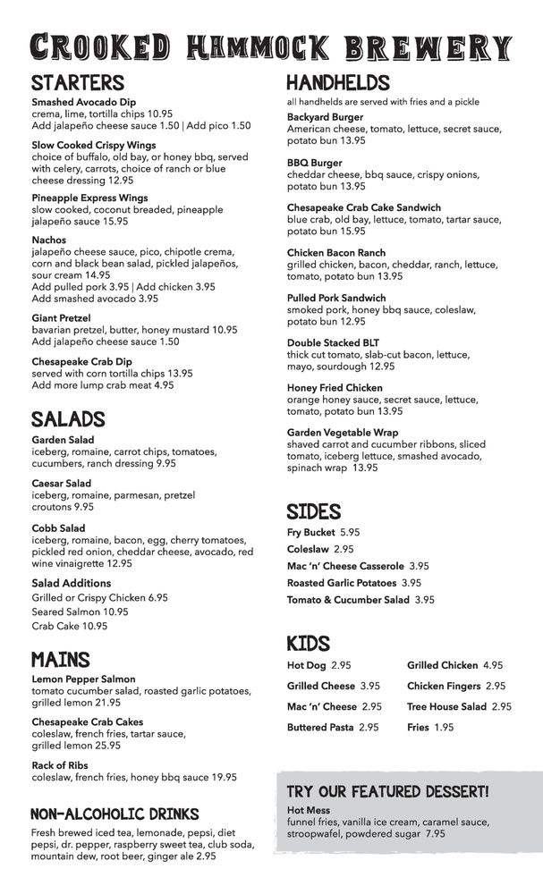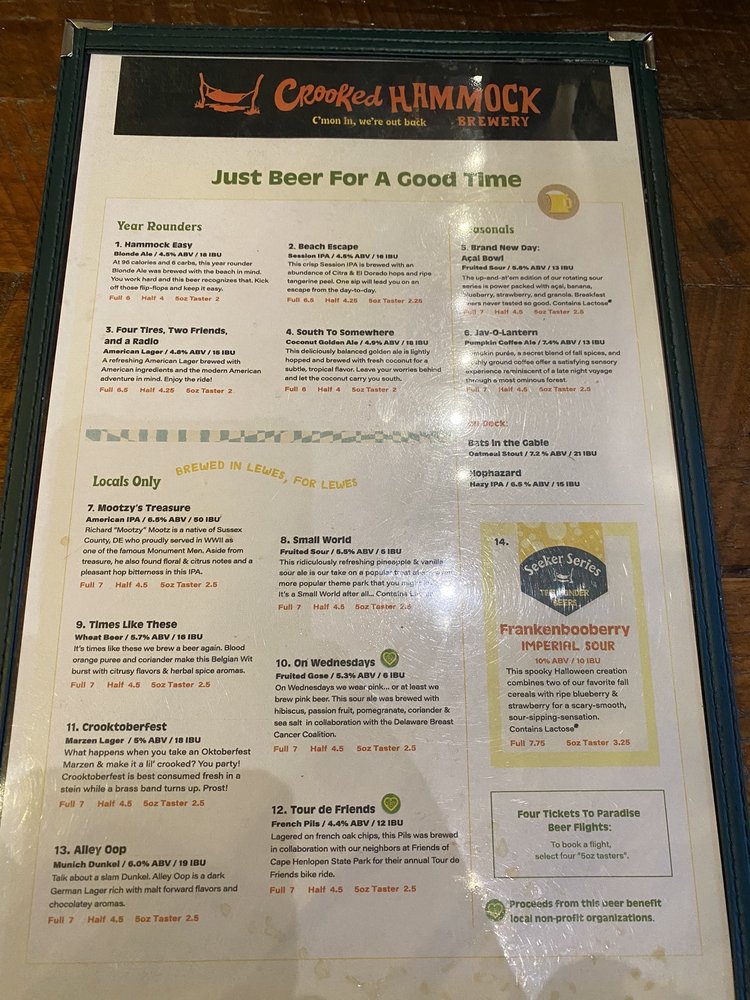 Crooked Hammock Brewery in Lewes, DE offers a diverse menu with options for all tastes. From extensive drink selections to vegan and vegetarian choices, this spot caters to a variety of preferences. Customers have praised the friendly and prompt service, with one reviewer noting the fantastic service and phenomenal food. The atmosphere is described as casual and trendy, perfect for families and groups, with outdoor seating and live music on the weekends. The bar boasts skilled bartenders and a range of craft beers. The location's unique feature of a play area for kids adds to its family-friendly appeal. With happy hour specials, full bar options, and covered outdoor seating, Crooked Hammock Brewery stands out as a must-visit spot for delicious food and a great time.